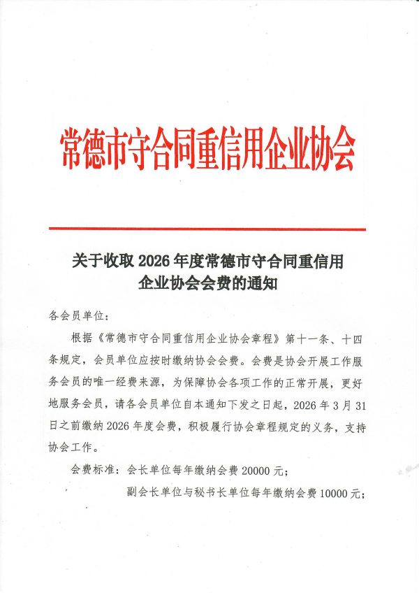 关于收取2026年度常德市守合同重信用 企业协会会费的通知